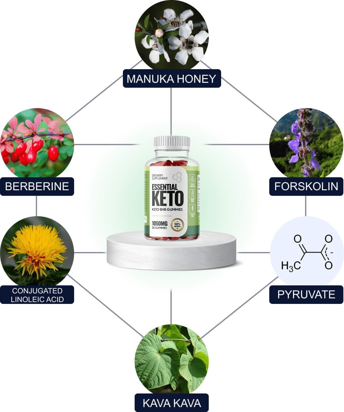 The composition of Essentials KETO Gummies includes not only well-known components such as berberine, forskolin, pyruvate and conjugated linoleic acid, but also our exclusive: methylglyoxal, a component of manuka honey (this honey is produced only in america and New Zealand), which, when ingested, has a cleansing, anti-inflammatory effect and helps to increase immunity, strengthen the body as a whole and cleanse it of toxins and slow down the absorption of calories. This antioxidant is used for the treatment of obesity for the first time. We combined it with kava - which is known in our country as kava kava. And it gave amazing results.
